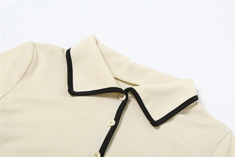 - Two-piece matching set: cropped polo top + above-knee mini skirt — effortless coordination.